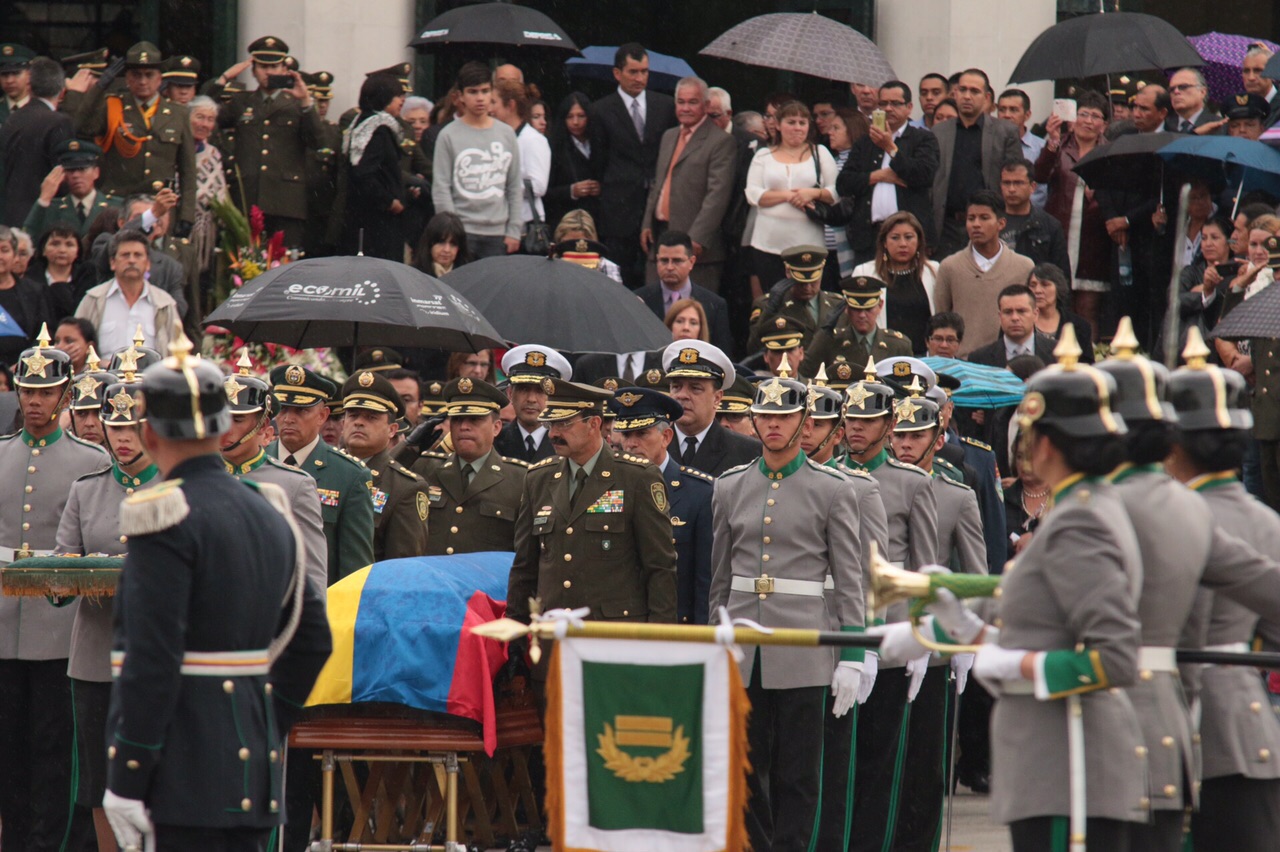 El teniente coronel de la Policía Nacional de Colombia Alfredo Ruiz, quien falleció el viernes en un atentado de las Farc en el suroeste del país, fue despedido este domingo en un funeral con honores en Bogotá, y en medio de pedidos de paz.