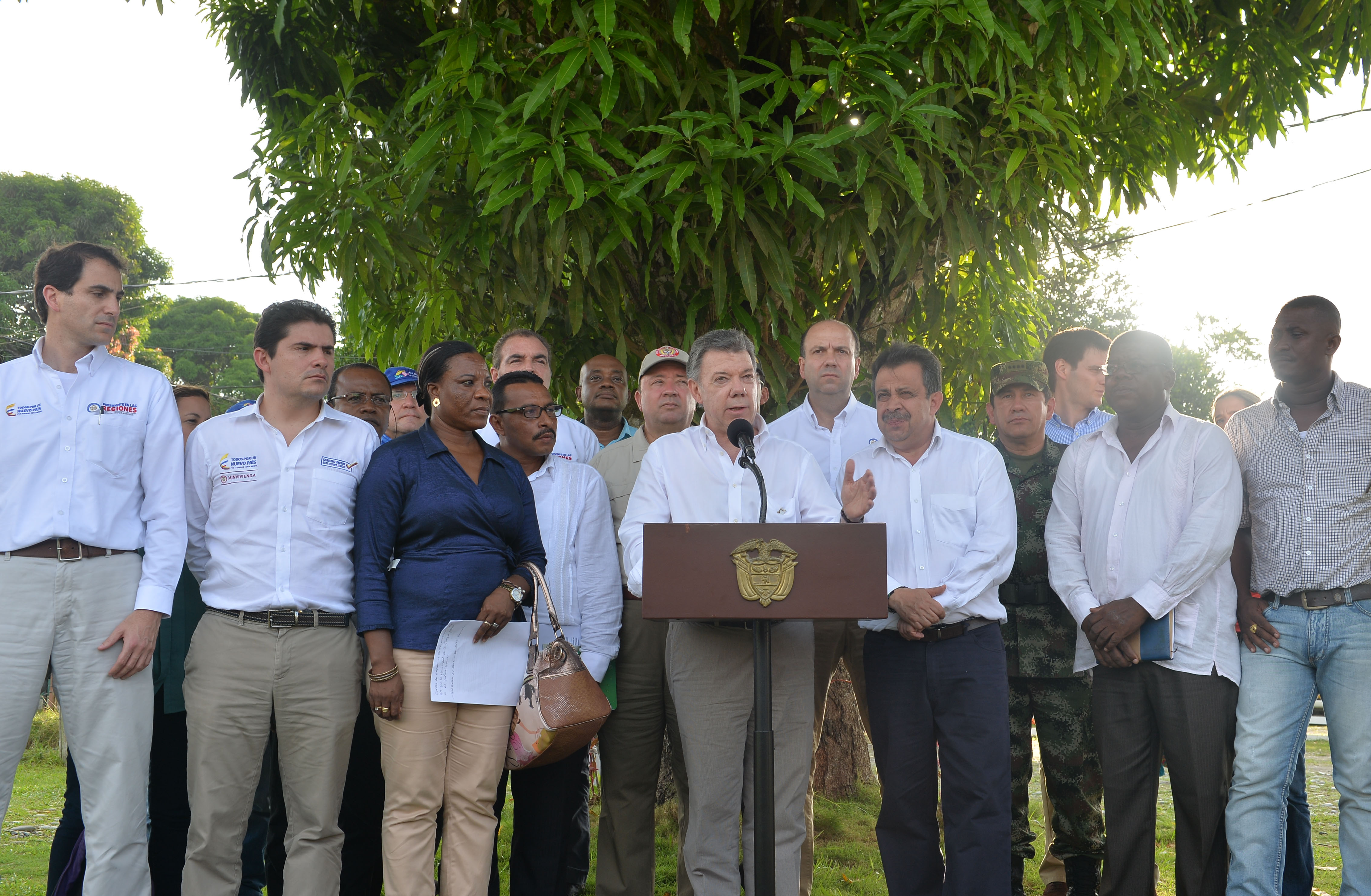 El Jefe del Estado estuvo acompañado en Tumaco por el Gobernador de Nariño, Raúl Delgado; los ministros de Ambiente, Gabriel Vallejo; Vivienda; Luis Felipe Henao; Minas y Energía, Tomás González; y Agricultura, Aurelio Iragorri, así como por el Comandante de las FF.MM. general Juan Pablo Rodríguez.