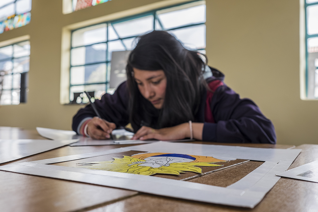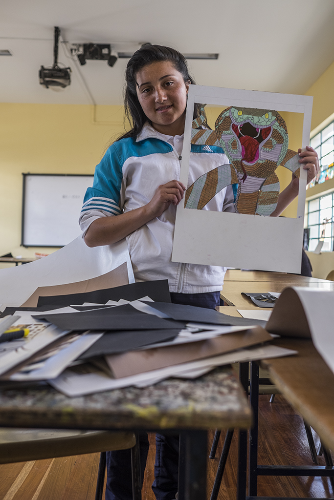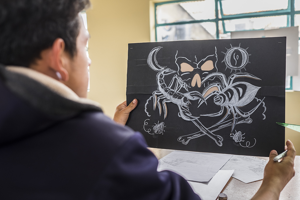 “Para esto se necesita mucha concentración; uno se puede demorar hasta cuatro días haciendo uno de estos dibujos. Eso es chévere porque pide mucho de tu mente”, comenta Carol Ortiz. Junto a ella, 14 estudiantes más dibujan, borran y cortan grandes pliegos de papel.