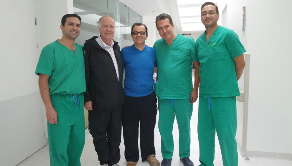 “Equipo de cirugía robótica de la Clínica Marly: Luis Blanco, Rafael Clavijo y @CamiloGiedelman junto a @OIZuluaga”.