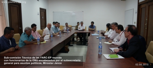 “En el día de hoy, domingo 2 de agosto, integrantes de la delegación de paz de las Farc se reunieron en la ciudad de La Habana, Cuba con una delegación de funcionarios de la ONU encabezados por el subsecretario general para asuntos políticos, Miroslav Jenca para discutir qué papel va a desempeñar este organismo en el mecanismo de monitoreo y verificación en un eventual escenario de cese al fuego y de hostilidades bilateral y definitivo.