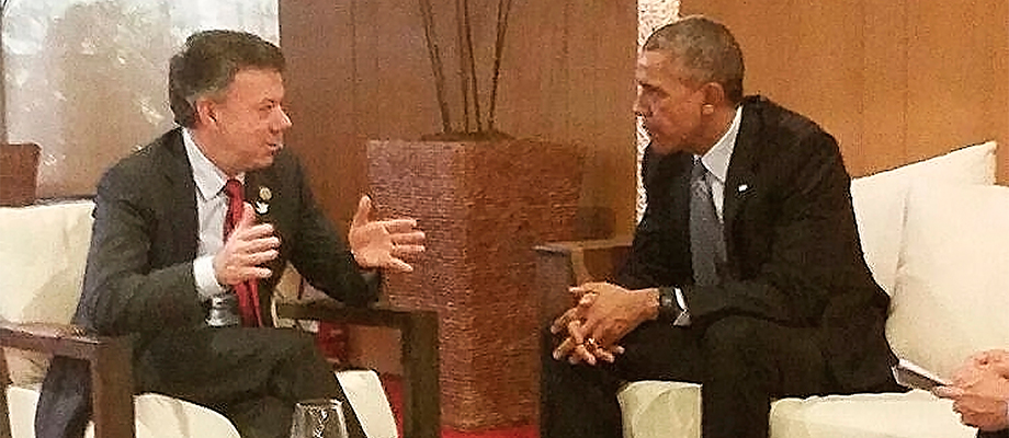 Manila, Filipinas, 18 de Noviembre_ RAM_ Concluyó su último día de agenda en Asia el presidente Juan Manuel Santos en el marco del foro económico de los países APEC que comenzó el pasado lunes en Manila, Filipinas. Uno de sus últimos encuentros bilaterales del jefe de Estado colombiano se dio con el presidente de Estados Unidos. Barack Obama se comprometió con el voto afirmativo para impulsar ante el Consejo de Seguridad de las Naciones Unidas la verificación y ayuda logística que vigile el alto al fuego bilateral cuando se pacte con las Farc.
