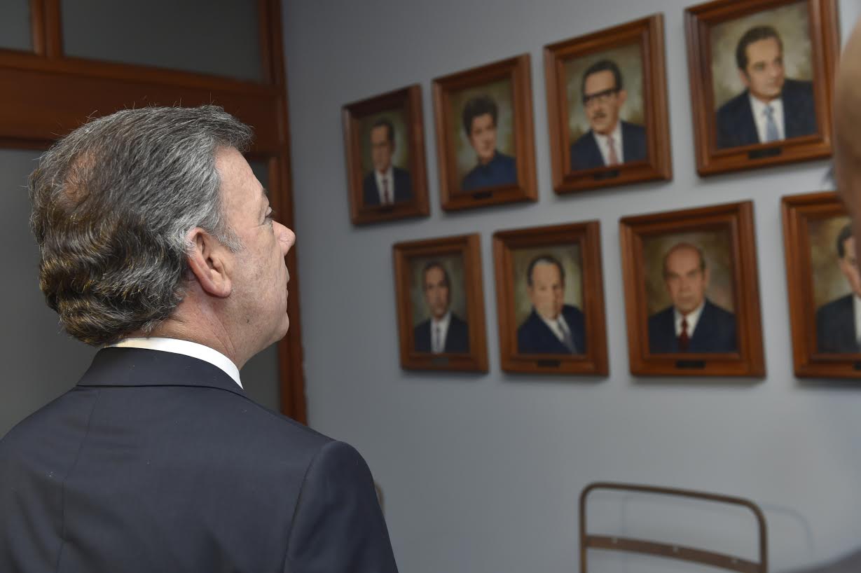Juan Manuel Santos Calderón, observa las imágenes de los magistrados de la Corte Suprema de Justica inmolados el 6 y el 7 de noviembre de 1985 en Bogotá.