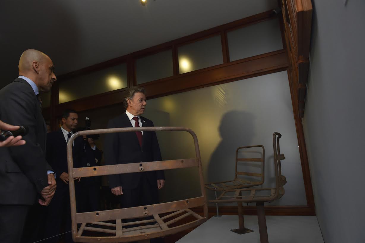 Santos recorrió la exposición de aquellos objetos recobrados luego de los hechos luctuosos acaecidos hace 30 años en el Palacio de Justicia.