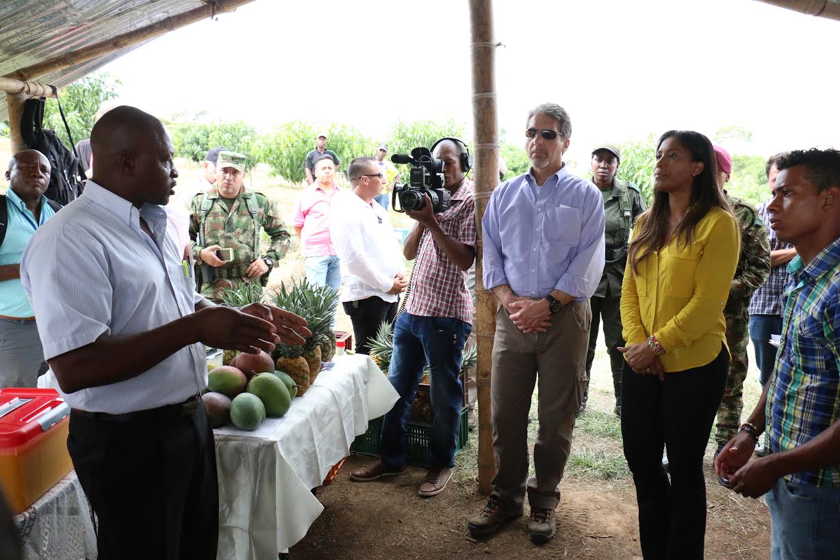 El Embajador de los Estados Unidos en Colombia, Kevin Whitaker, y una delegación del Gobierno de Colombia encabezada por el Ministro Consejero para el Posconflicto, Derechos Humanos y Seguridad, Rafael Pardo, visitaron ayer el municipio de Santander de Quilichao (Cauca). Durante la visita, los funcionarios conocieron de primera mano algunos de los proyectos que apoya el gobierno de Estados Unidos en el Cauca, a través de la Agencia para el Desarrollo Internacional (USAID) y la Sección de Asuntos Antinarcóticos y Aplicación de la Ley (INL), todos orientados a contribuir con los esfuerzos de Colombia por alcanzar una paz duradera e inclusiva.
