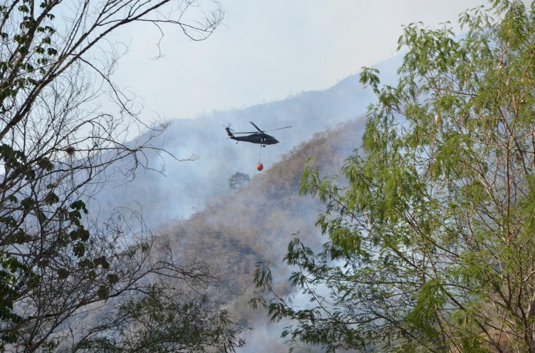 Ejército y Policía Nacional junto con la comunidad trabajan en el sector donde La Fuerza Aérea también realiza varias descargas para liquidar el incendio forestal.