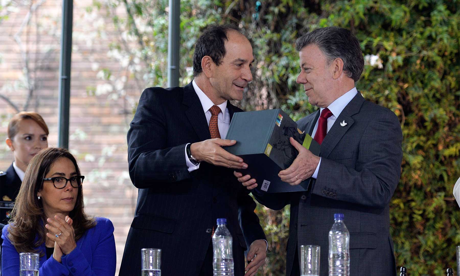 El Rector de la Universidad Externado, Juan Carlos Henao, obsequió al Presidente Juan Manuel Santos una obra de cinco tomos sobre minería y desarrollo, este lunes durante la celebración de los 130 años del claustro.