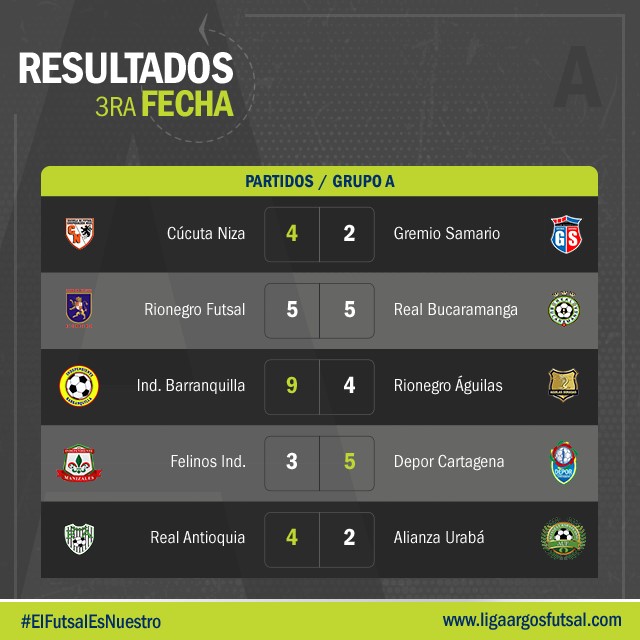 El líder del grupo A es Real Antioquia, invicto y con puntaje perfecto, mientras que en el grupo B, cuatro equipos empatan en puntos, pero la diferencia a favor es para Deportivo Saeta.