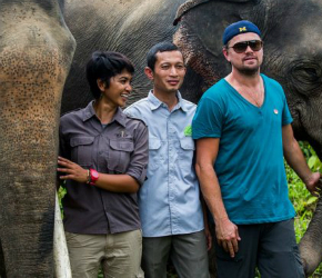 DiCaprio fue fotografiado junto a defensores ambientalistas locales, a lado de dos elefantes de Sumatra, una especie en vía de extinción.