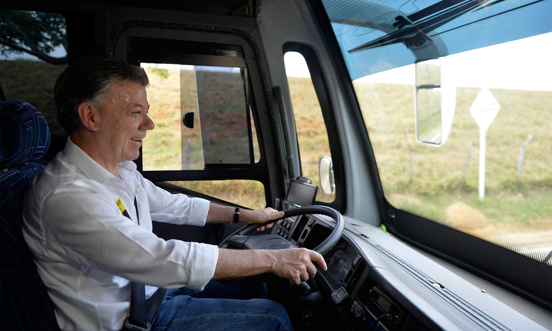 El Presidente Santos llegó este sábado conduciendo el autobús de la comitiva a Barichara, Santander, donde se lanzó el programa de rutas turísticas ‘Seguro te va a encantar’, promovido por el Ministerio de Comercio, Industria y Turismo.