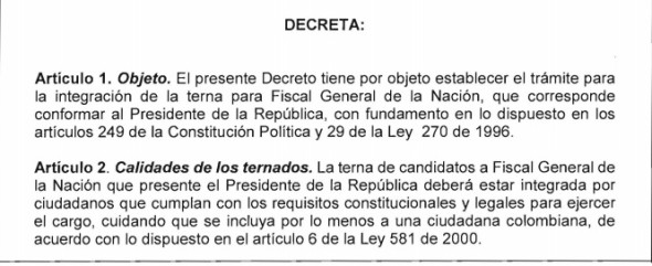 El decreto presidencial establece un plazo de siete días contados a partir de la fecha para que los colombianos que crean que reúnen los requisitos para desempeñarse en el cargo de Fiscal General, se postulen para hacer parte de la terna de la cual la Corte Suprema escogerá al titular para los próximos 4 años.