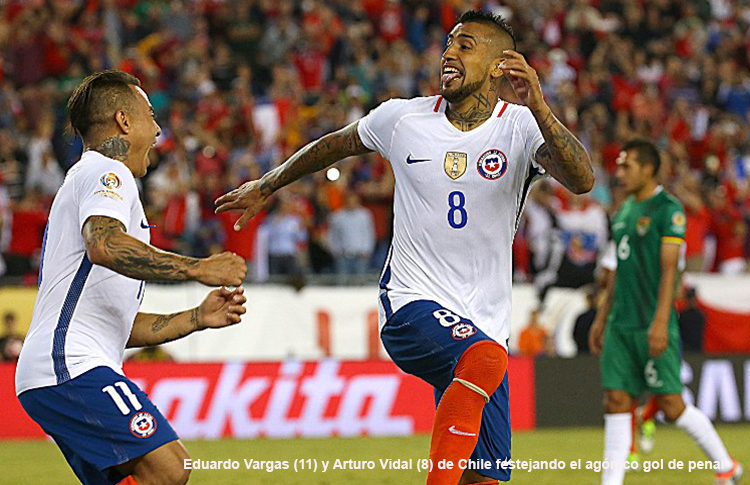 Foxborough, 10 de junio_ RAM_ La selección de fútbol de Chile derrotó agónicamente este viernes a Bolivia por 2-1, con un penal al minuto 90+10, y mantuvo las ilusiones vivas de defender su corona en la Copa América Centenario.