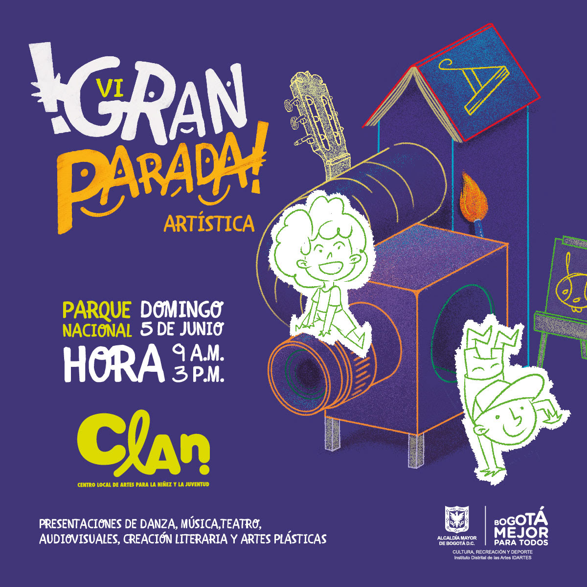 El domingo 5 de junio, desde las 9 de la mañana y hasta las 3 de la tarde, los capitalinos disfrutarán de un show gratuito en el que los niños de los 20 Centros locales de formación artística ubicados en Bogotá, darán una muestra de todo su talento en la danza, el arte dramático, la creación literaria, el audiovisual, la música y las artes plásticas. Esta es la VI versión de la Parada Artística que Idartes, entidad adscrita a la Secretaría de Cultura, Recreación y Deporte, entrega a la ciudad.