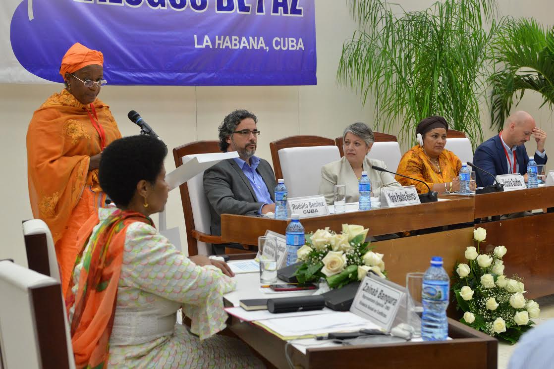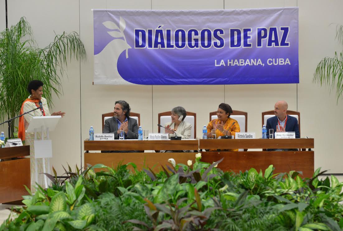 Así mismo, agradecemos la presencia en el acto de presentación de los acuerdos con la inclusión de género y el acompañamiento en este proceso de Phumzile Mlambo-Ngcuka, directora ejecutiva de la entidad de la Organización de las Naciones Unidas para la Igualdad de Género y el Empoderamiento de la Mujer – ONU Mujeres; Zainab Bangura, representante especial del Secretario General de las Naciones Unidas para la Violencia Sexual en los Conflictos Armados; Luiza Carvalho, directora regional para las Américas y el Caribe de ONU Mujeres; Belén Sanz, representante de ONU Mujeres en Colombia; Juan Fernando Cristo, Ministro del Interior; María Emma Mejía, Embajadora extraordinaria y plenipotenciaria y representante permanente de Colombia ante Naciones Unidas; Martha Ordoñez, Consejera Presidencial para la Equidad de la Mujer, y el enviado especial de la Unión Europea para el proceso, Eamon Gilmore; así como a las mujeres colombianas e integrantes de la comunidad LGBTI, representantes de las organizaciones sociales, y a los países acompañantes Cuba y Noruega.