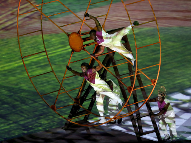 Después de la exuberante Gisele, fue el turno de los malabaristas, quienes en una de las cabeceras del estadio armaron con cubos blancos el nacimiento del Brasil contemporáneo, antes de dar comienzo a la tradicional música del Samba, el “pasinho” y el funk nacido en las entrañas de las favelas, que dieron rienda suelta a las manifestaciones de alegría y emoción del público que cantó y bailó “País tropical”.