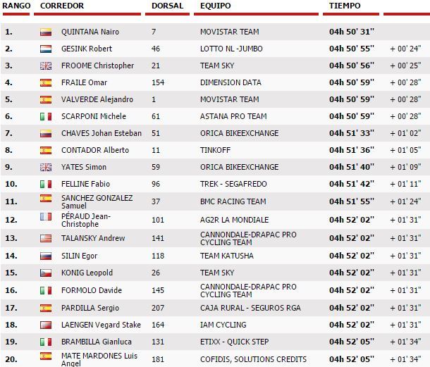 Con un tiempo de 38 horas, 37 minutos y siete segundos, Quintana es líder con 57 segundos de ventaja sobre su compañero de Equipo, Alejandro Valverde, que es segundo, y de 58 sobre su verdugo y rival directo, el británico del Sky Team.