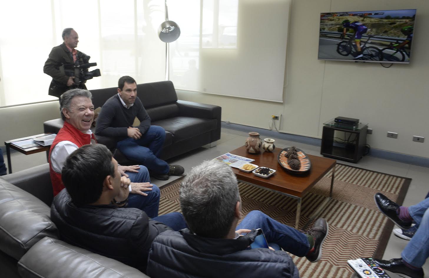El Presidente Santos haciéndole fuerza a los pedalistas colombianos en la penúltima etapa de la Vuelta a España, en la que Nairo se afirma en el primer lugar y Chávez va por el tercero.