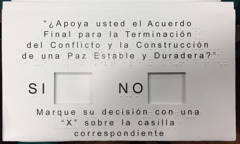 El funcionario explicó que la tarjeta de votación tendrá un tamaño de media carta y en su reverso aparece el texto de la pregunta formulada por medio del Decreto 1391 de 2016: ¿Apoya usted el Acuerdo Final para la Terminación del Conflicto y la Construcción de una paz estable y duradera? Y a continuación dos casillas, una para el Sí y otra por el No.