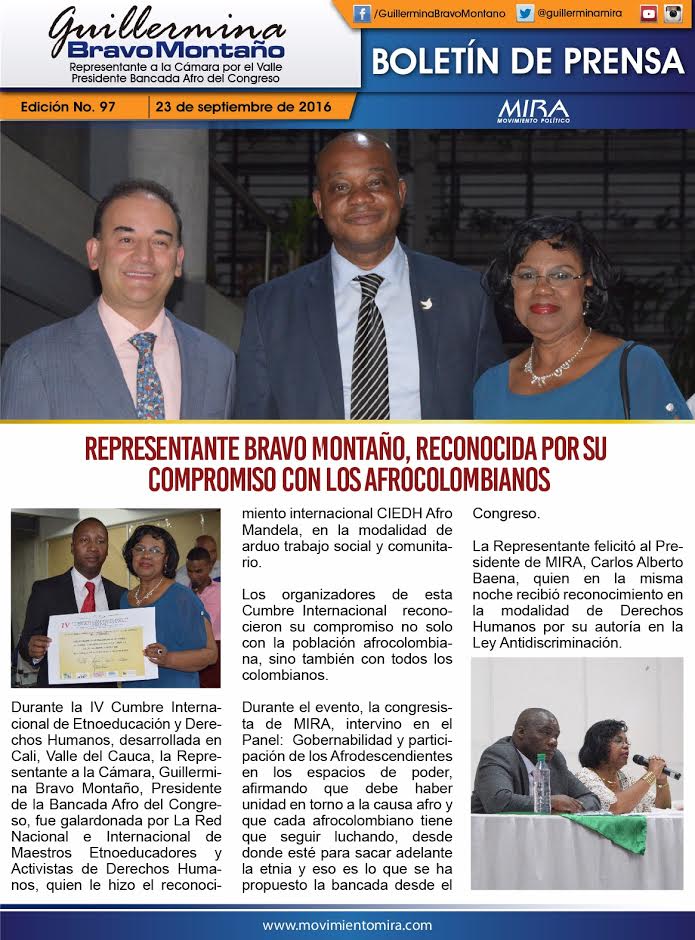 Durante la IV Cumbre Internacional de Etnoeducación y Derechos Humanos, desarrollada en Cali, Valle del Cauca, la Representante a la Cámara, Guillermina Bravo Montaño, Presidente de la Bancada Afro del Congreso, fue galardonada por La Red Nacional e Internacional de Maestros Etnoeducadores y Activistas de Derechos Humanos, quien le hizo el reconocimiento internacional CIEDH Afro Mandela, en la modalidad de arduo trabajo social y comunitario.