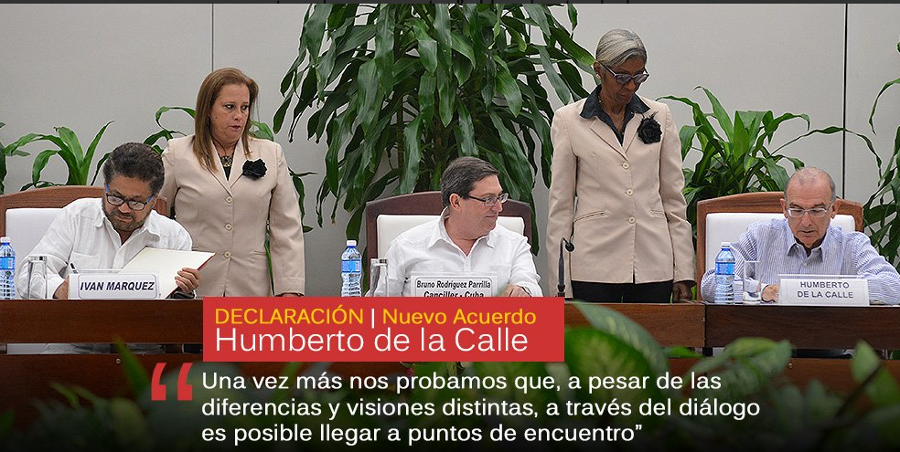 El nuevo documento fue firmado por los jefes negociadores del Gobierno, Humberto de la Calle, y la guerrilla, Iván Márquez (alias de Luciano Arango), quienes han encabezado nueve días de intensas reuniones en la capital cubana para alcanzar un nuevo consenso con el fin de «alcanzar una paz estable y duradera».