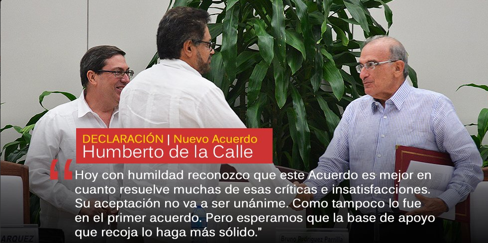 «Hemos alcanzado un nuevo Acuerdo Final para la terminación del conflicto armado, que integra cambios, precisiones y aportes de los más diversos sectores de la sociedad y que revisamos uno a uno», según el comunicado conjunto leído por diplomáticos de los países garantes del proceso de paz, Cuba y Noruega.