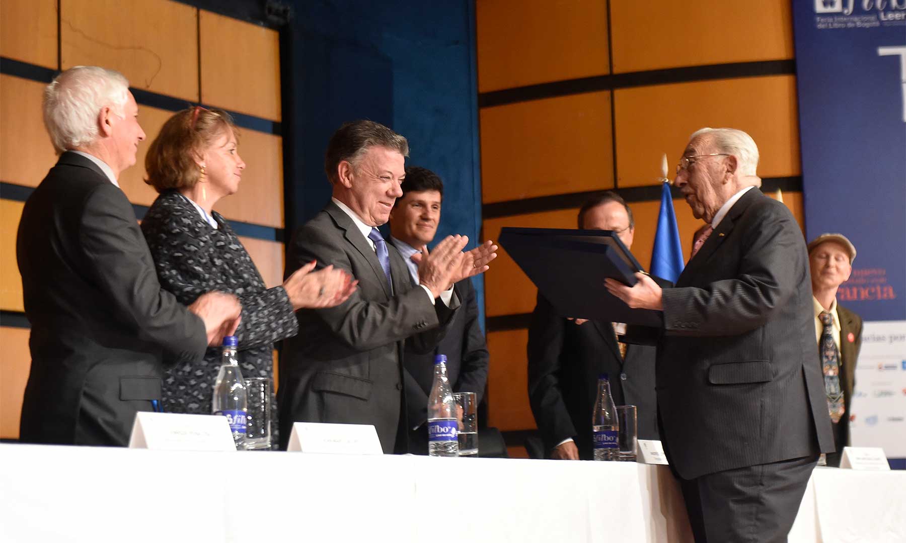 El Presidente Juan Manuel Santos felicita al ex director de Corferias y cofundador de la Feria Internacional del Libro de Bogotá, Óscar Pérez Gutiérrez, honrado con una placa conmemorativa al trigésimo aniversario del importante evento.