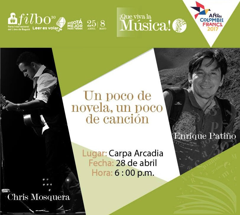 Un poco novela, un poco canción es un diálogo entre el escritor Enrique Patiño y el compositor Chris Mosquera, que tendrá lugar el próximo viernes, 28 de abril, en la Feria Internacional del Libro de Bogotá.