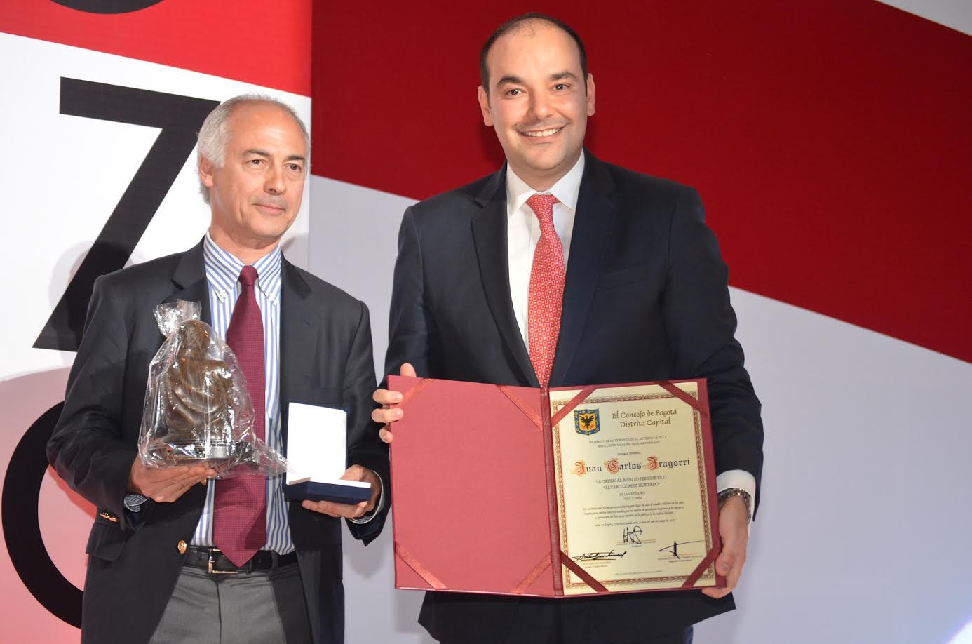 Juan Carlos Iragorri, director de la Maestría en Periodismo de la Universidad del Rosario, Publicaciones Semana y RCN, recibe el premio de manos de Horacio José Serpa, presidente del Concejo de Bogotá. Foto Cortesía Oficina de Prensa Concejo de Bogotá