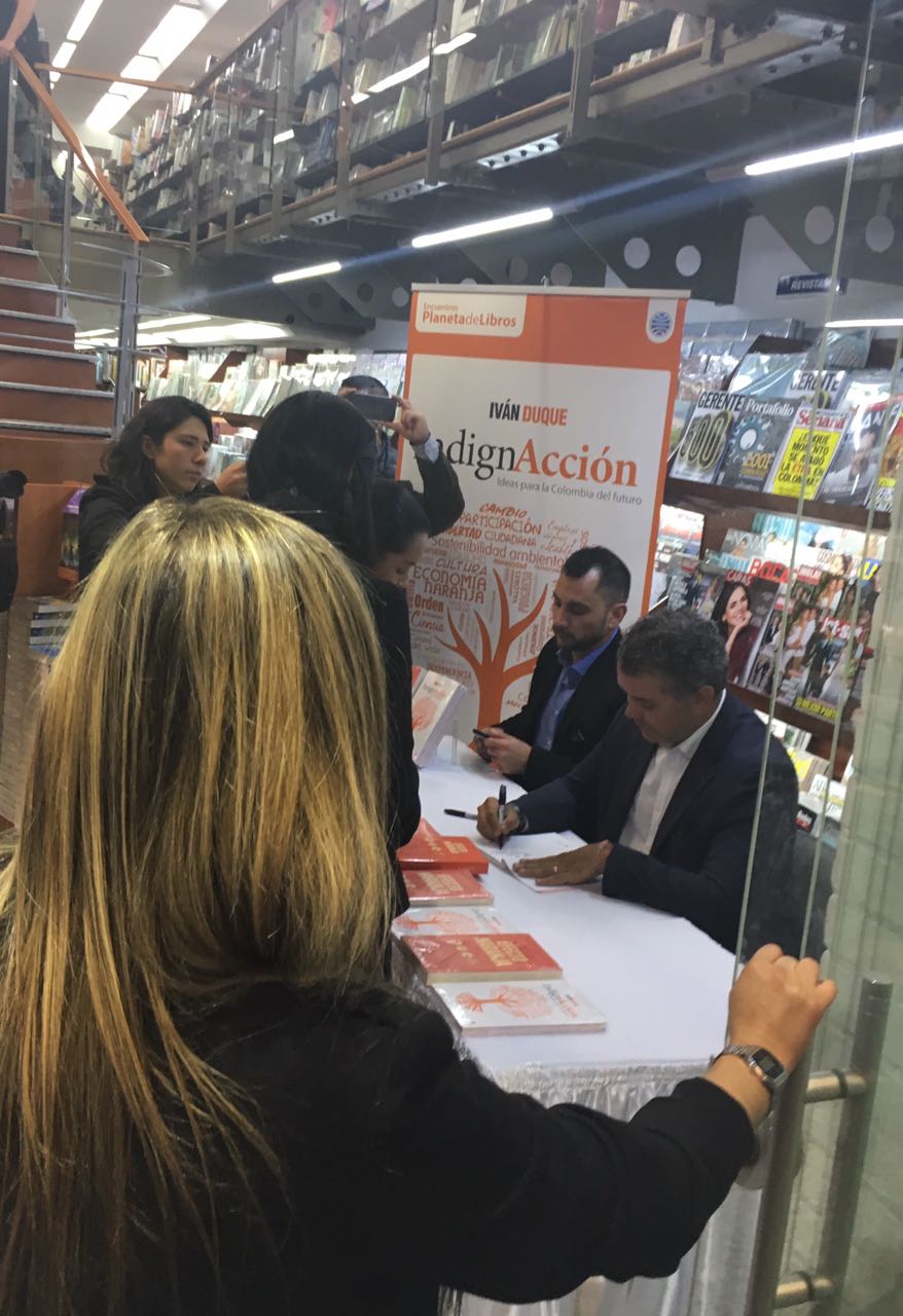 Este viernes 14 de julio el senador Iván Duque llevó a cabo una actividad y firmatón de su libro IndignaAcción en la librería Nacional del centro comercial Unicentro, el evento fue catalogado por los asistentes como de gran éxito y editorial Planeta puso a la venta de los asistentes el mayor número de ejemplares de otro de los libros del escritor-senador antioqueño que trata asuntos sociales y económicos con el mayor desenvolvimiento por el conocimiento de los mismos.