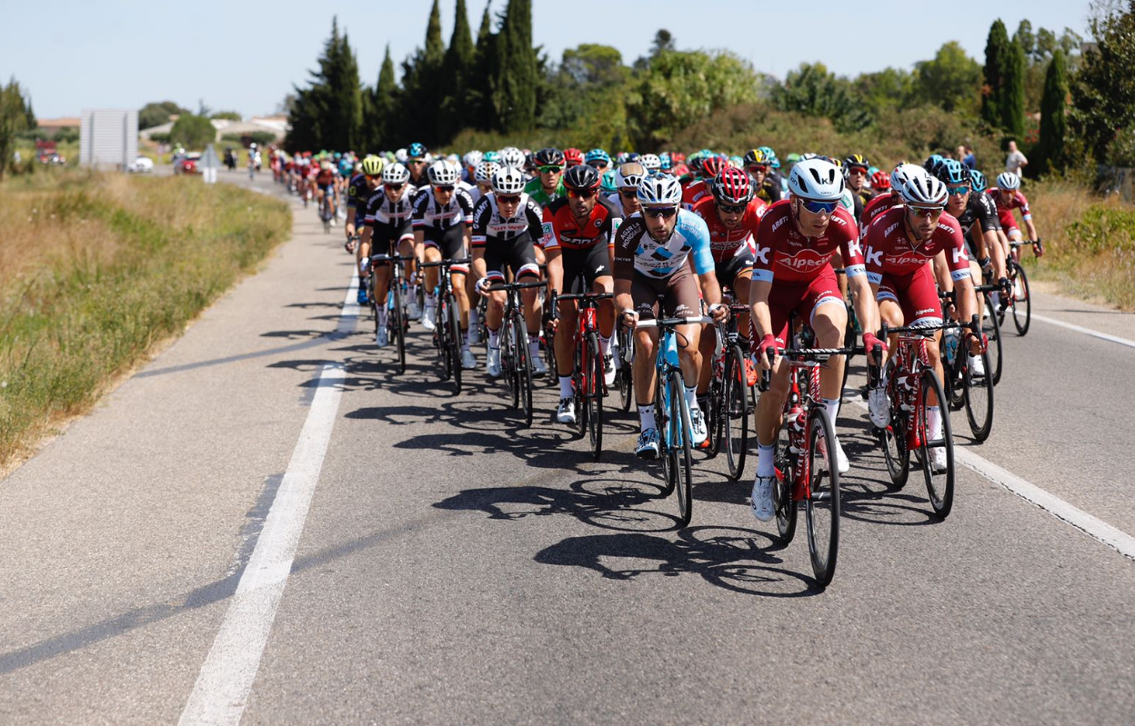La primera mitad de etapa ha transcurrido con pocos movimientos, pero sí con mucha tensión: los 198 corredores que partieron de Nîmes han rodado conjuntamente en el pelotón comandado por equipos importantes de la general como BMC, Team Sky o Bahrain-Merida. La amenaza del viento paralizaba un grupo que a pesar de ello han rodado más rápido del horario previsto en una jornada totalmente llana.