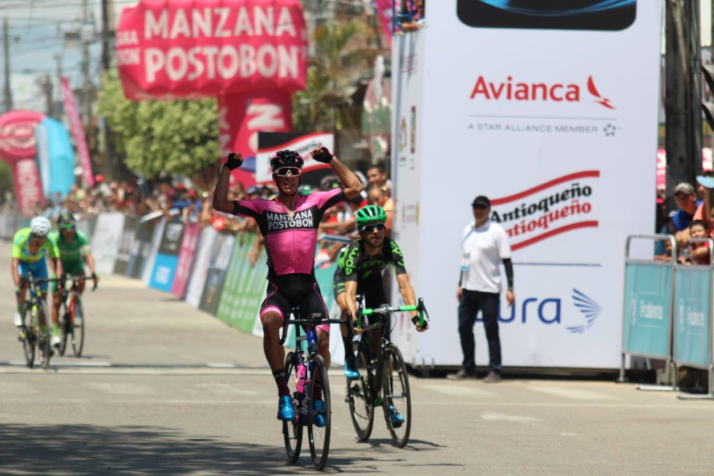 Wilmar Andrés Paredes (Team Manzana Postobón) festejó a lo grande su llegada en la segunda etapa de la Vuelta a Colombia Oro y Paz, que tuvo final en Puerto Boyacá, tras 173 kilómetros de recorrido.