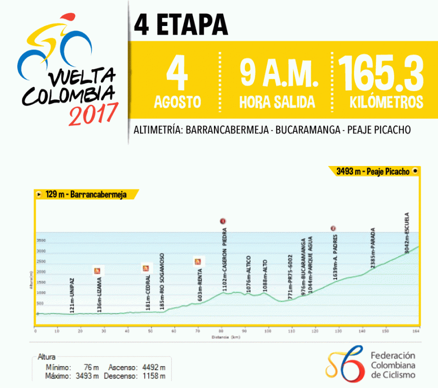 Este viernes 4 de agosto se disputará una de las etapas más importantes de la Vuelta a Colombia Oro y Paz 2017. Se trata del ascenso inédito al peaje de Picacho, situado a 3.700 metros sobre el nivel del mar. La fracción partirá desde la plazoleta de la alcaldía de Barrancabermeja y recorrerá un tramo de 165,3 kilómetros, con dos premios de montaña: Caserón de Piedra (1ra) y Alto de Los Padres (2da).