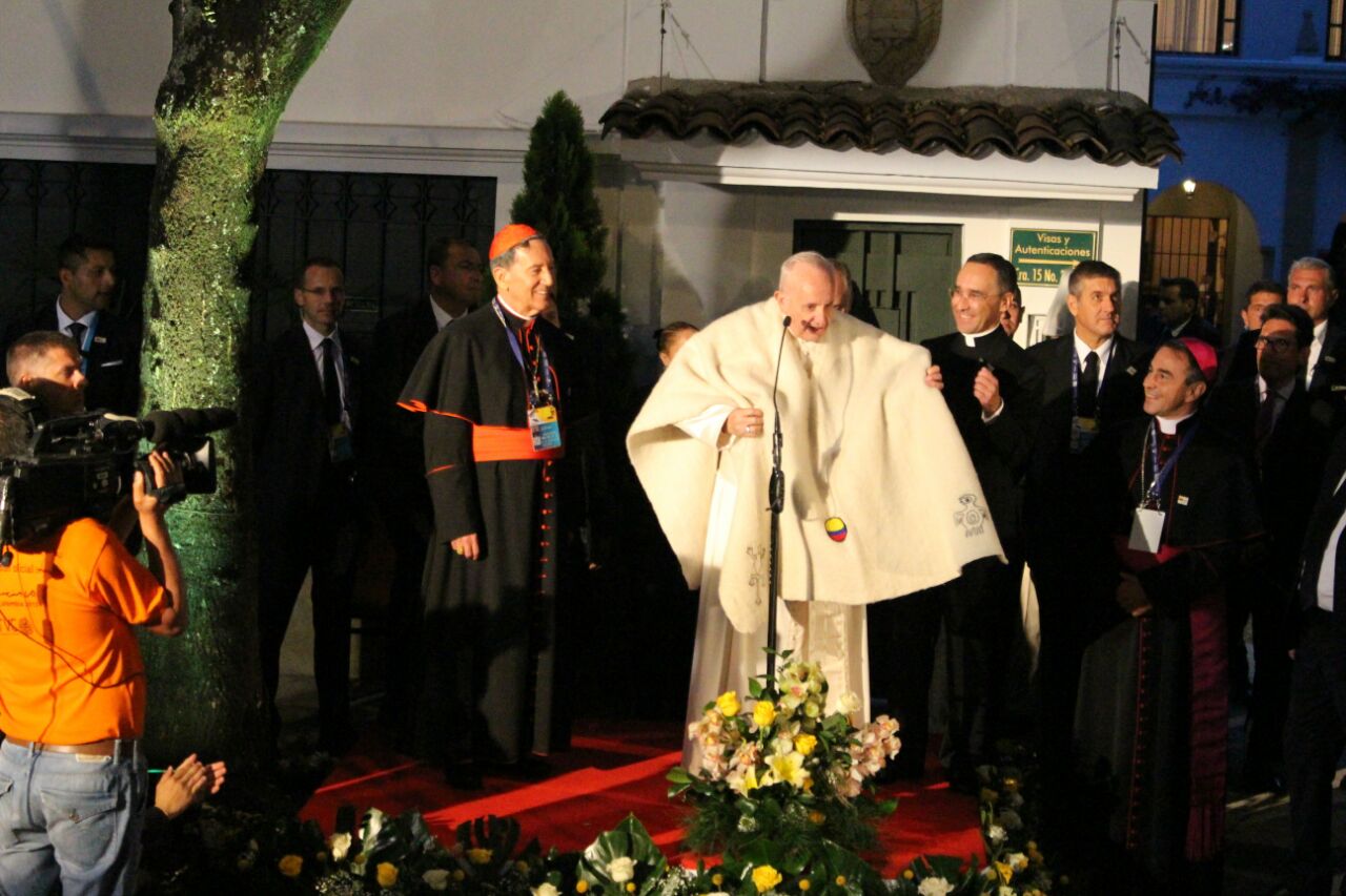 A su llegada a la Nunciatura Apostólica, donde pernoctará durante su visita en Colombia, recibió a unos 200 jóvenes de Idipron, el Instituto Distrital para la Protección de la Niñez y la Juventud, que le rapearon, le bailaron, le hicieron peticiones como adelantar un proceso de canonización del padre Javier de Nicoló y le entregaron regalos como una ruana de lana, unas velas  y una biblia hechas por ellos y a su vez recibieron camándulas del Pontífice.