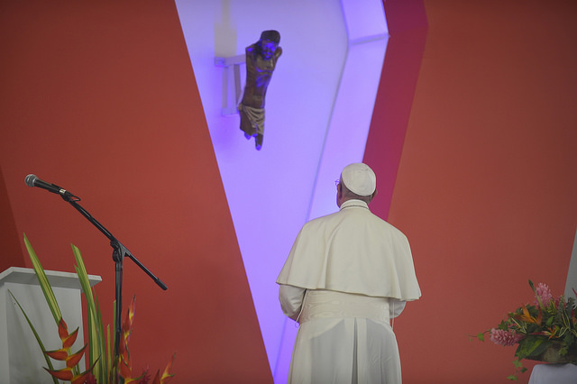 El Papa terminó su intervención poniendo una serie de intenciones ante la imagen del crucificado, el Cristo negro de Bojayá, a la que compuso una oración.