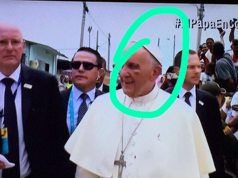 De manera intempestiva sobre las 10:40 de la mañana el Papa Francisco debió ser bajado del papamovil para ser atendido en su rostro por un leve golpe que afectó uno de sus ojos en el cual se apreció hinchazón. Un par de gotas de sangre mancharon la casulla del Pontífice.
