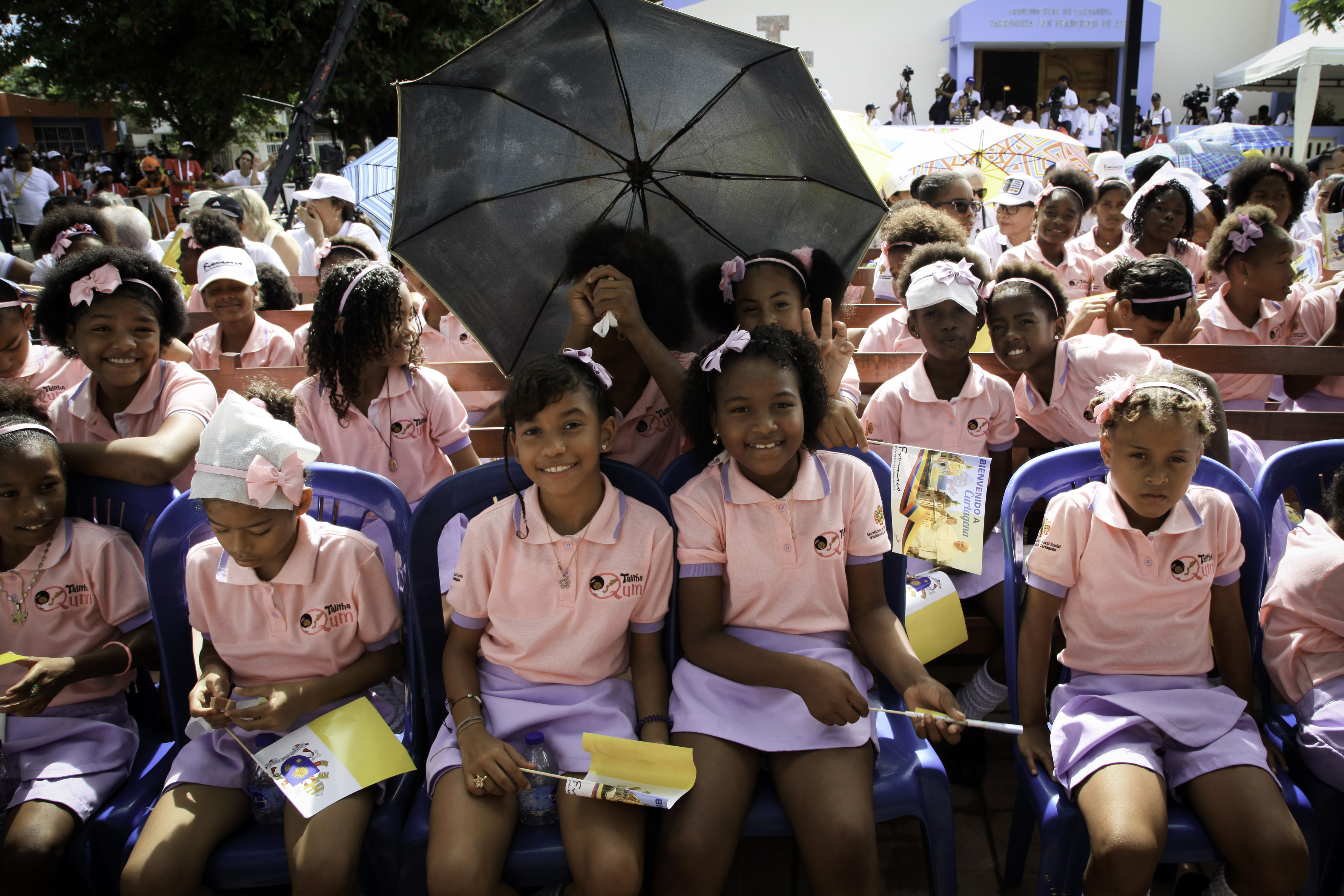 Julio Londoño, del biblioparque del barrio, había recibido la instrucción de los organizadores en la localidad que tendría un punto de bendición para que los niños entonaran “Viva el Papa, viva el Papa”. Anavictoria, conocida en Cartagena como la contadora de Historias se vistió para la ocasión con una manta guajira de color azul, los niños vistieron sus camisetas con un letrero que decía “Empápate” y abajo, el nombre de la canción.