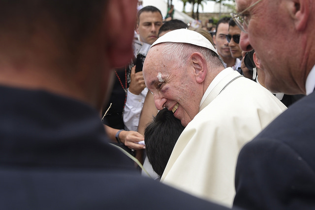 Después de las bendiciones de piedras para las primeras obras de las sedes de las fundaciones Talita Kun y Renacer, la caravana emprendió el recorrido. El Papa, desde su vehículo alcanzó a escuchar los versos que los niños le cantaban, le decían: “Desde este rincón de patria de tantas historias negras, de esclavitud y piratas, te saludamos santo Padre”. Todo iba bien hasta cuando el conductor –que más bien parecía del SITP—frenó intempestivamente y el Pontífice se fue de frente golpeándose fuertemente.