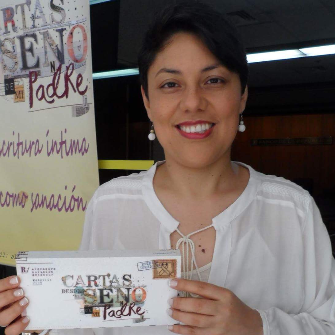Su vida transcurría normal hasta que en agosto de 2014 llega el diagnóstico de cáncer de mama, una noticia fuerte que ella asumió como un proceso de sanación y no como enfermedad; sin embargo, sintió morir cuando quince días después de su primera cirugía a su padre lo diagnostican con cáncer de estómago, el ser que más ha amado, pero gracias a su fe y al amor de las personas a su alrededor los dos decidieron caminar el sendero del cáncer con toda la actitud positiva. Luego de la tercera quimio su padre se coloca muy mal y trasciende, Alexandra sigue con dolor, pero con más fuerza su proceso y es así como pasa 3 cirugías, 16 quimioterapias y 25 radioterapias. Al finalizar el proceso se hace la pregunta ¿para qué quedé viva? y por varias causalidades decide escribir su historia para contar cómo vivió el proceso y cuáles aprendizajes le dejó y el producto final es «Cartas desde el seno de mi padre» un libro objeto que rescata el estilo epistolar, en un formato innovador y que lleva píldoras de amor y fuerza para quien atraviese una situación no agradable en su vida, es un texto que Alexandra define como «Quimioterapia para el alma».