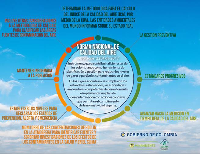 En este contexto, el Ministerio de Ambiente y Desarrollo Sostenible desde hace dos años comenzó el proceso de construcción de la nueva Norma Nacional de Calidad del Aire (Resolución 2254 de 2017), la cual de forma progresiva y con un horizonte de tiempo a 2030, establece niveles máximos permisibles más estrictos de los contaminantes que afectan la salud en los centros urbanos, principalmente las partículas finas PM10 y PM2.5. En este proceso de construcción, participaron autoridades ambientales, ministerios, expertos internacionales, colectivos ciudadanos, académicos y representantes de la industria mediante diferentes espacios de diálogo y consulta pública.