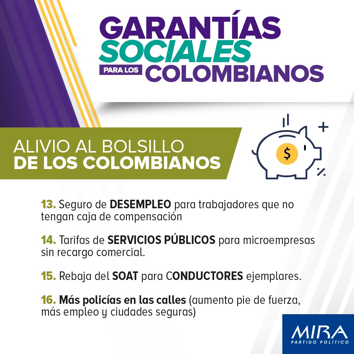 Nos pudimos dar cuenta que uno de los temas bandera entre otros, para el partido MIRA en la próxima legislatura será el alivio al bolsillo de los ciudadanos, buscando formas de erradicar el desempleo, de bajar las tarifas de los servicios públicos, la rebaja en el SOAT haciendo un compendio de propuestas en donde se encuentra el aumento de pie de fuerza, mas empleo y ciudades seguras.