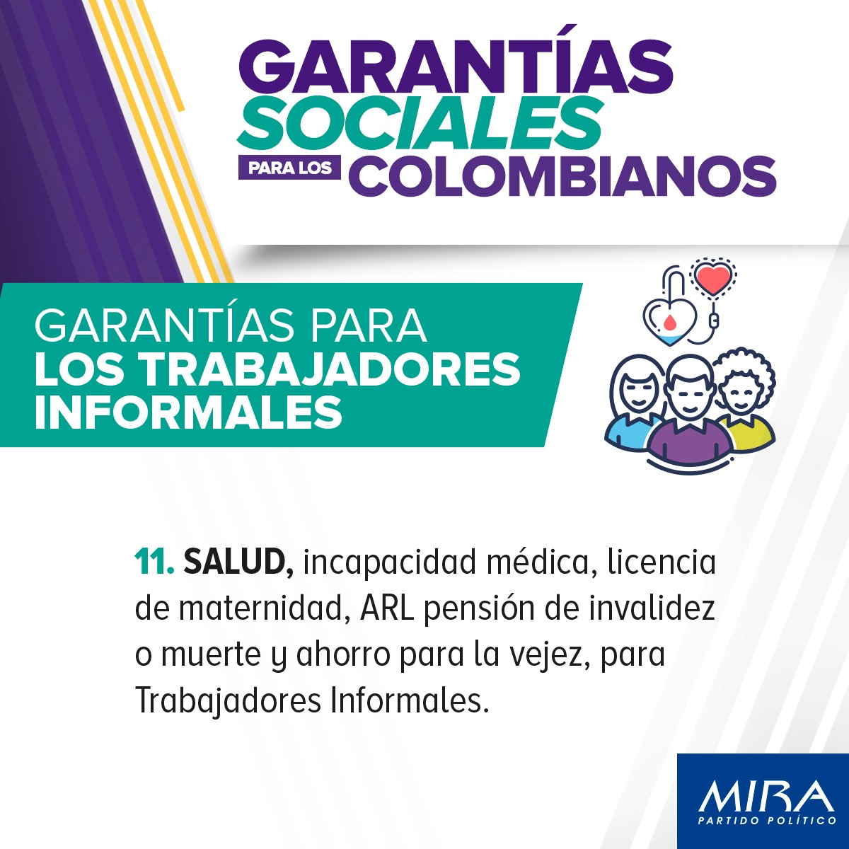 - Salud, incapacidad médica, licencia de maternidad, ARL, pensión de invalidez o muerte y ahorro para la vejez para trabajadores informales.
