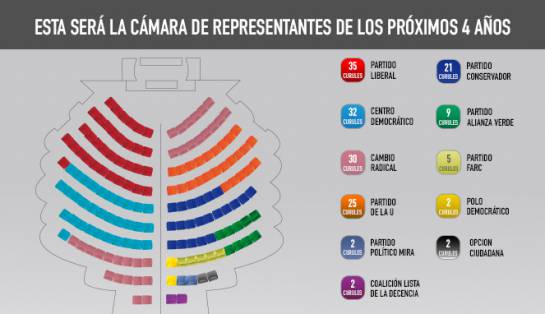 35 de las 166 curules de la Cámara fueron para el partido Liberal, seguido del Centro Democrático con 32; Cambio Radical con 30; 25 para el Partido de la U; 21 para el Partido Conservador Colombiano; 9 para la Alianza Verde; el partido MIRA, Polo Democrático, Opción Ciudadana y la Lista de la Decencia obtuvieron 2 curules cada uno y finalmente Colombia Justa Libres, Coalición Alternativa Santandereana AS y el Movimiento Alternativo Indígena y Social-MAIS- obtuvieron 1 curul cada uno.