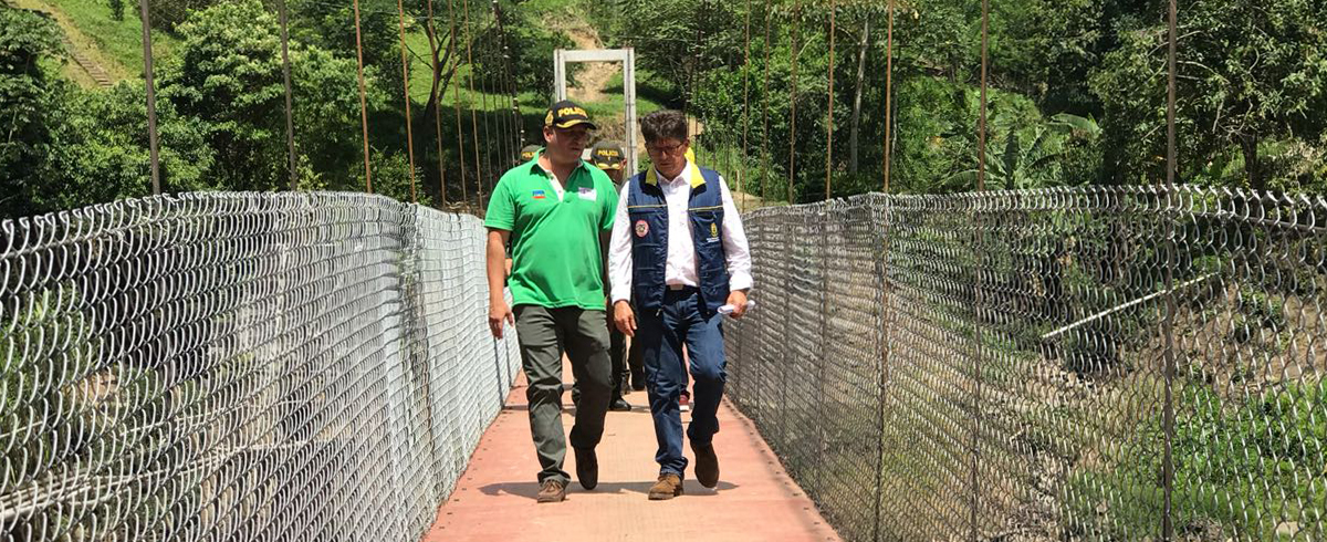 En el municipio de Filadelfia, Caldas, a través de un modelo participativo y comunitario, la Unidad Nacional para la Gestión del Riesgo de Desastres construyó en tiempo record un puente peatonal de 102 metros de luz, conectando nuevamente a varias comunidades de Caldas, luego de que una creciente del río Cauca en marzo de 2017, destruyera la infraestructura que había.