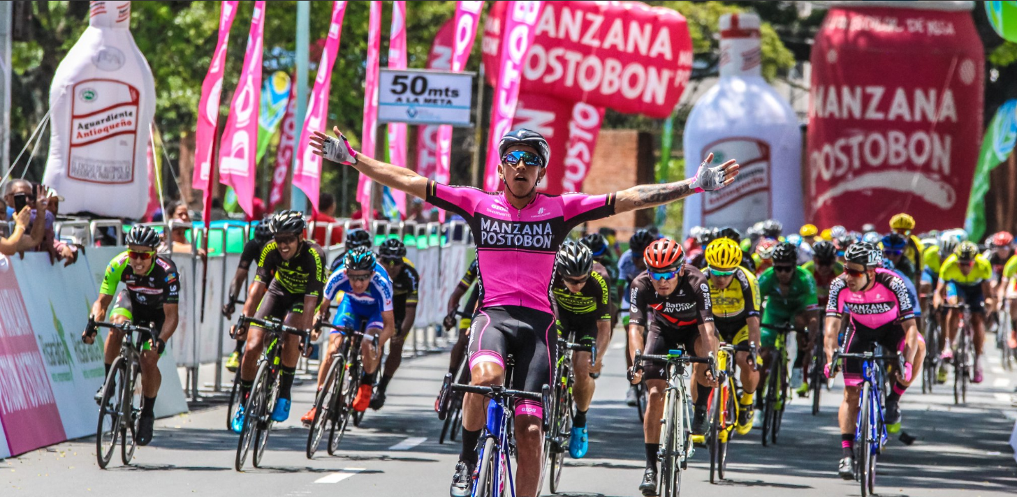 El boyacense Sebastián Molano (Team Manzana Posotobón) festejó en la llegada a Palmira (Valle del Cauca), municipio donde culminó la primera fracción de la Vuelta a Colombia Ministerio de Transporte Seguridad Vial.