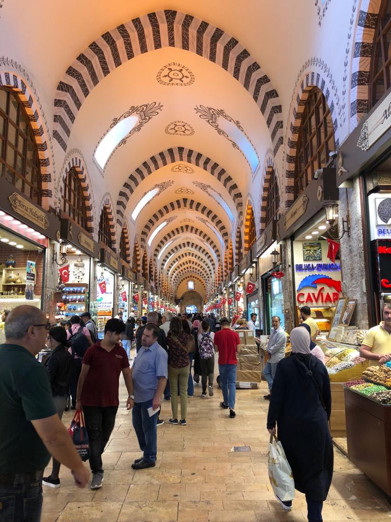 Estuvimos a nuestro ritmo el primer día, guiados por Lucía Jaramillo Ayerbe, quien repetía viaje y sabía de los atractivos de Estambul. Primer estación, la Plaza de Taksim, donde comienza o termina una larga Avenida peatonal, la Istiklal Caddesi, moderna, con almacenes lujosos a lado y lado, multicolor por sus andantes, turistas de todas partes del mundo, con grandes hoteles y tiendas, aseada, con ventas de castañas y mazorcas dulces, pashminas en cada zaguán, y músicos de esquina, que caminamos a paso lento, disfrutándola y con la retina alerta. Las callejuelas laterales llenas de restaurantes con sus mesas en las aceras y un ambiente bohemio que hubiéramos querido disfrutar en una noche deleitosa, pero que no fue posible por la premura del itinerario, las asociamos con novelas de intrigas, bailes de ombligo y cabarets, espías y actividades non santas, tramadas alrededor de los narguiles o pipas de agua con tabaco y otras yerbas, fruto tal vez tal vez este criterio del estereotipo descalificador que se tiene de ciudades y gentes, influenciado por lecturas e imaginaciones ligeras.