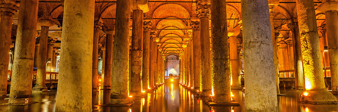 La Cisterna es para algunos, la verdadera joya de Estambul. Fu Basílica antes de ser dedicada a almacenar toneladas y toneladas de agua para surtir a los palacios y actualmente es un Museo, donde se admiran 336 columnas de los mas diversos estilos y procedencias, que soportan su bóveda de ladrillo. Los turistas van tras la fotografía al pie de dos columnas que tienen como base la cabeza de la Medusa, que con sus trenzas de serpiente dio origen a la leyenda de que no podía mirarse so pena de que quien lo hiciera se petrificaría. Monumental y misteriosa su edificación con sus columnas dirigiéndose desde el agua hasta el cielo.