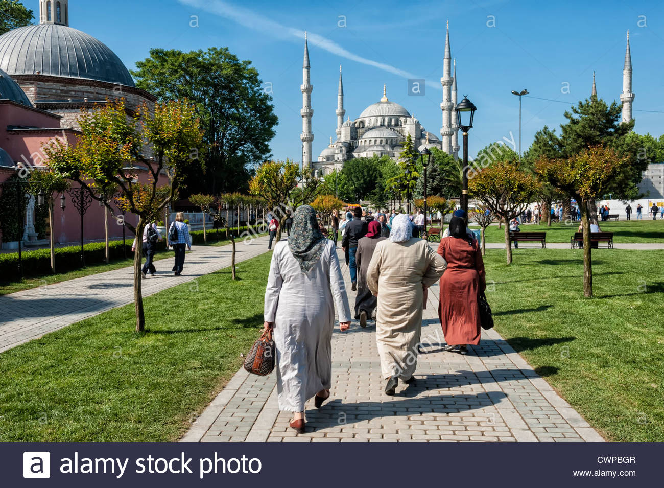 La Mezquita Azul, Mezquita del Sultán Ahmet, data su construcción de 1617 y sus seis minaretes y su cúpula elevada hasta unos cuarenta y tres metros, la convierte en referente obligado para todo el Islam Turco. Sus sorprendentes enchapados en azulejos del S. XVII, bien conservados, le señala su característica principal, de donde deriva su nombre. Hechos a mano, representan frutas, flores y cipreses. Las Mezquitas a su interior contienen el mihrab que es un lugar al que hay que dirigir la mirada cuando se reza, una especie de altar desde el cual el Imán dirige las oraciones y un púlpito desde el que se predica a los creyentes los días viernes. En la Mezquita Azul son de llamativo esplendor.