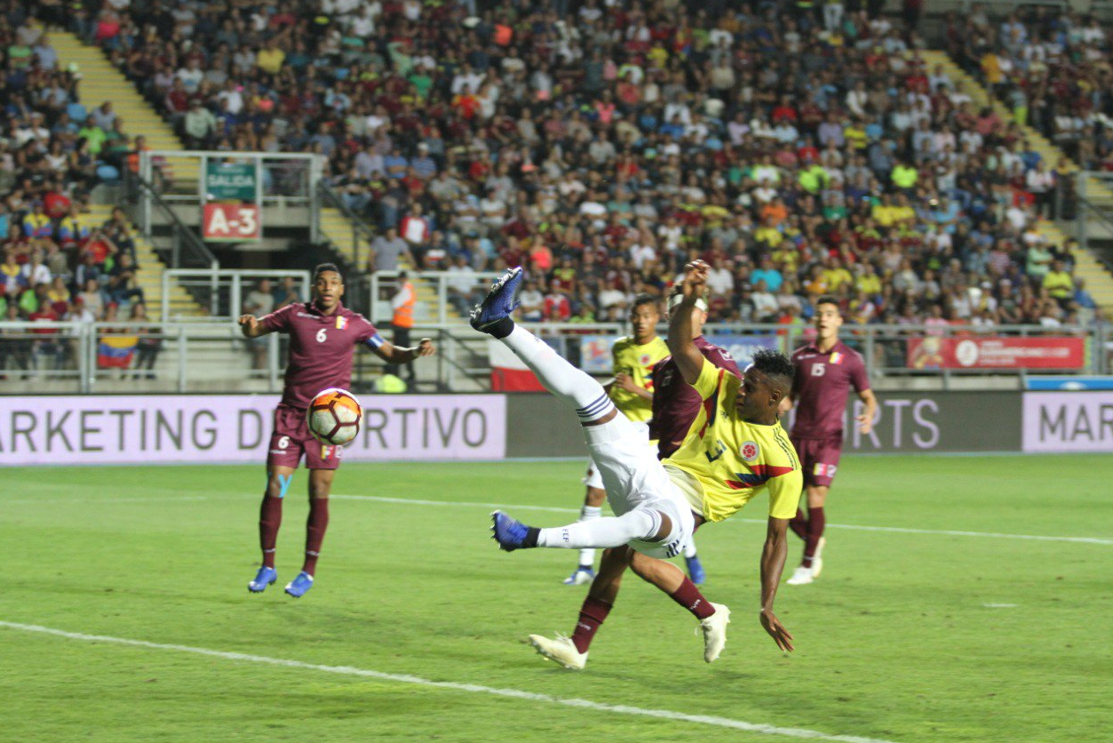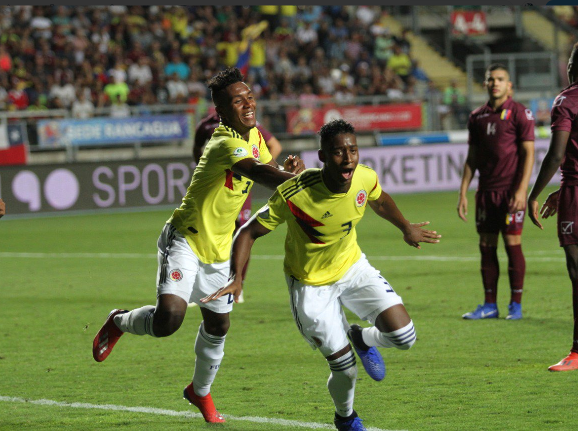Rancagua, 07 de enero_ RAM_ Colombia reaccionó a tiempo para volver a meterse de lleno en la pelea por una plaza para el Mundial Sub 20 de Polonia. Venció 0-2 a Venezuela en el cierre de la cuarta jornada del Sudamericano de la categoría de Chile.
