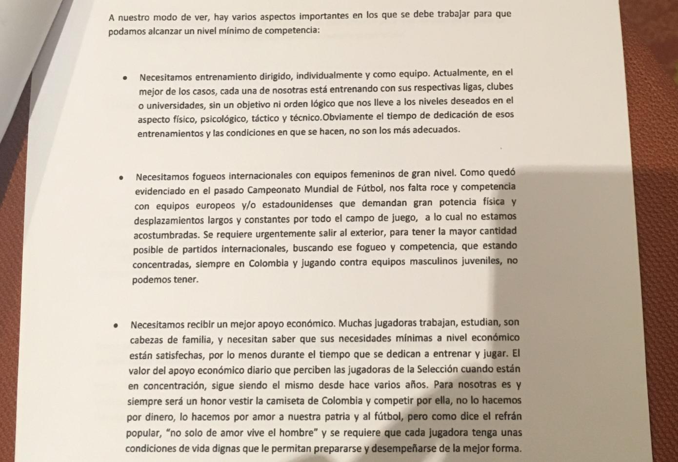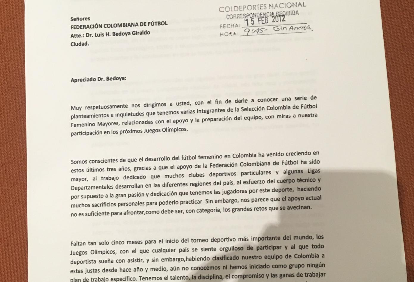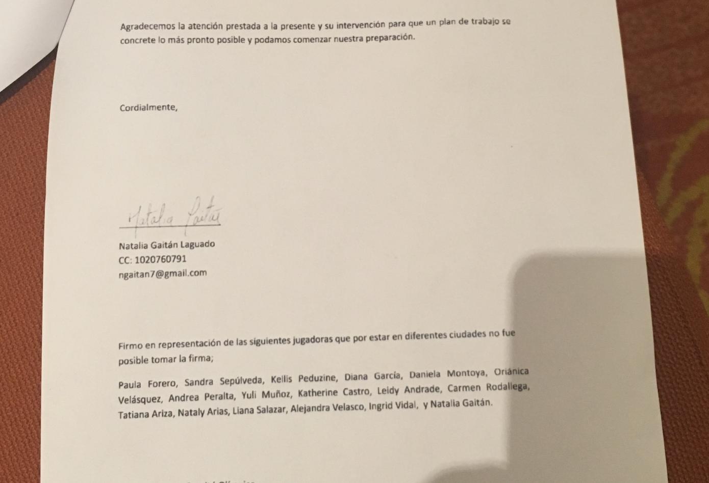 El documento tiene sello de recibido, pero según la misma Gaitán esto no tuvo respuesta alguna: «Yo, Natalia Gaitán, capitana de la Selección Colombia, he tratado de muchos medios y muchas formas comunicarme con ellos; tengo una carta del año 2012 donde tratamos tres temas, tiene sello de recibió pero nunca fue contestada».