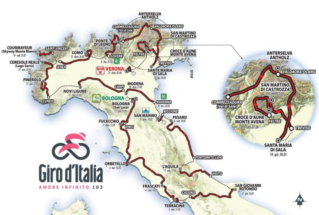 La última semana tendrá tres finales en alto antes de la contrarreloj final: Anterselva, San Martino di Castrozza y el penúltimo día en Monte Avena, final de una difícil etapa: 193 kilómetros, que asciende Campo, Rolle y Manghen antes de subir el Croce d’Aune. La edición 102 del Giro bajará el telón, el 2 de junio en Verona, con otra prueba contra el reloj. Esta vez será de 16 kilómetros con final en la Arena y un ascenso a Torricelle, donde el español Óscar Freire se impuso en el Mundial de Ciclismo en 2004. Por ahora el segundero del reloj que marca el inicio de la primera grande del año continúa su cuenta regresiva sin parar y muchos siguen a la espera de que los grandes favoritos inicien esa lucha codo a codo, por la ‘maglia rosa’.